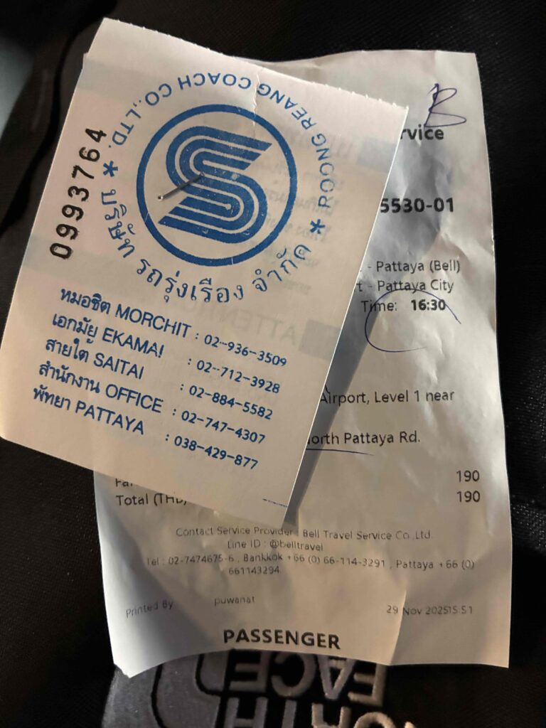 自分は「ターミナル21」の近くのホテルだったので「ノースパタヤ行き」のレシートみたいなチケットを購入しました。190バーツです。乗車時刻、シート番号が記載されているのでちゃんと確認しましょう。